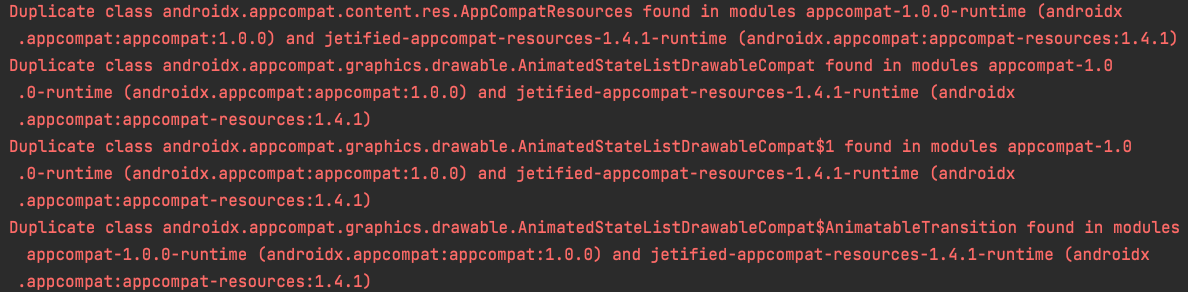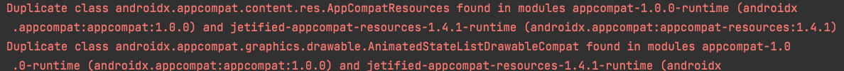 에러 내용을 보시면 Duplicate로 시작하는 문장에서 두 번째 괄호에 (androidx.appcompat:appcompat-resources:1.4.1)로 된 것을 확인할 수 있습니다.