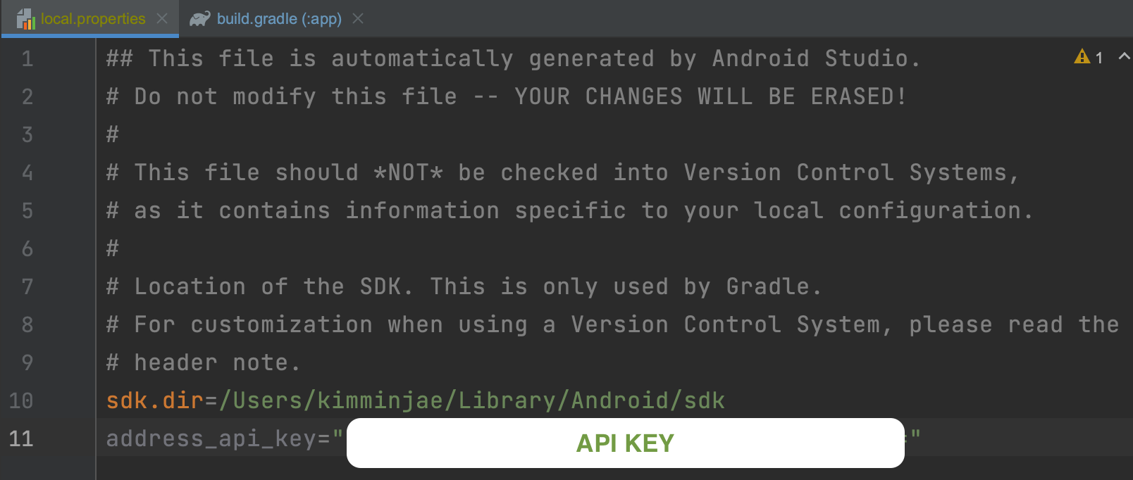 이 KEY를 관리하는 방법은 여러 가지 있겠지만 저는 Gradle Scripts > local.propertices를 사용합니다.
