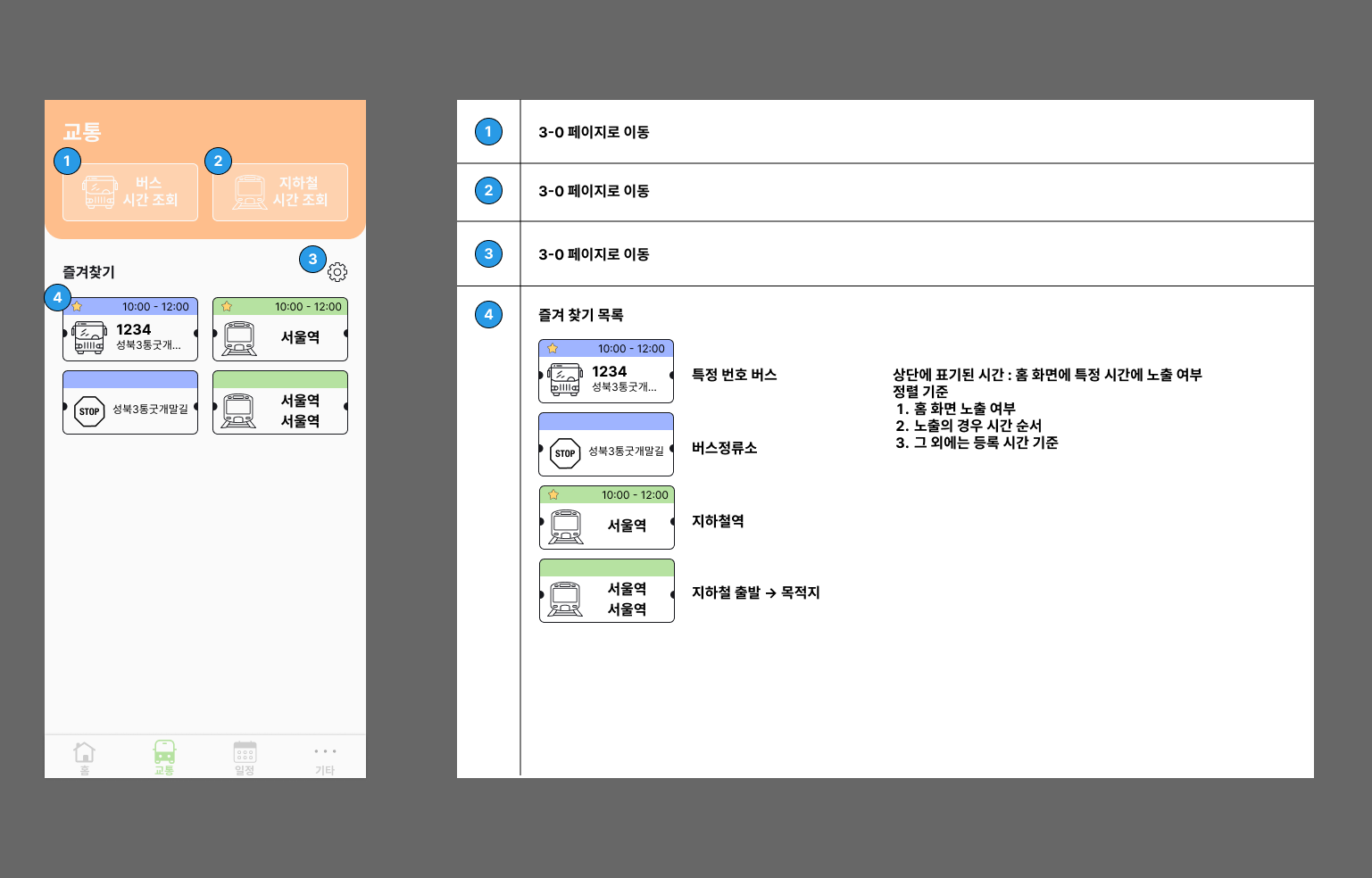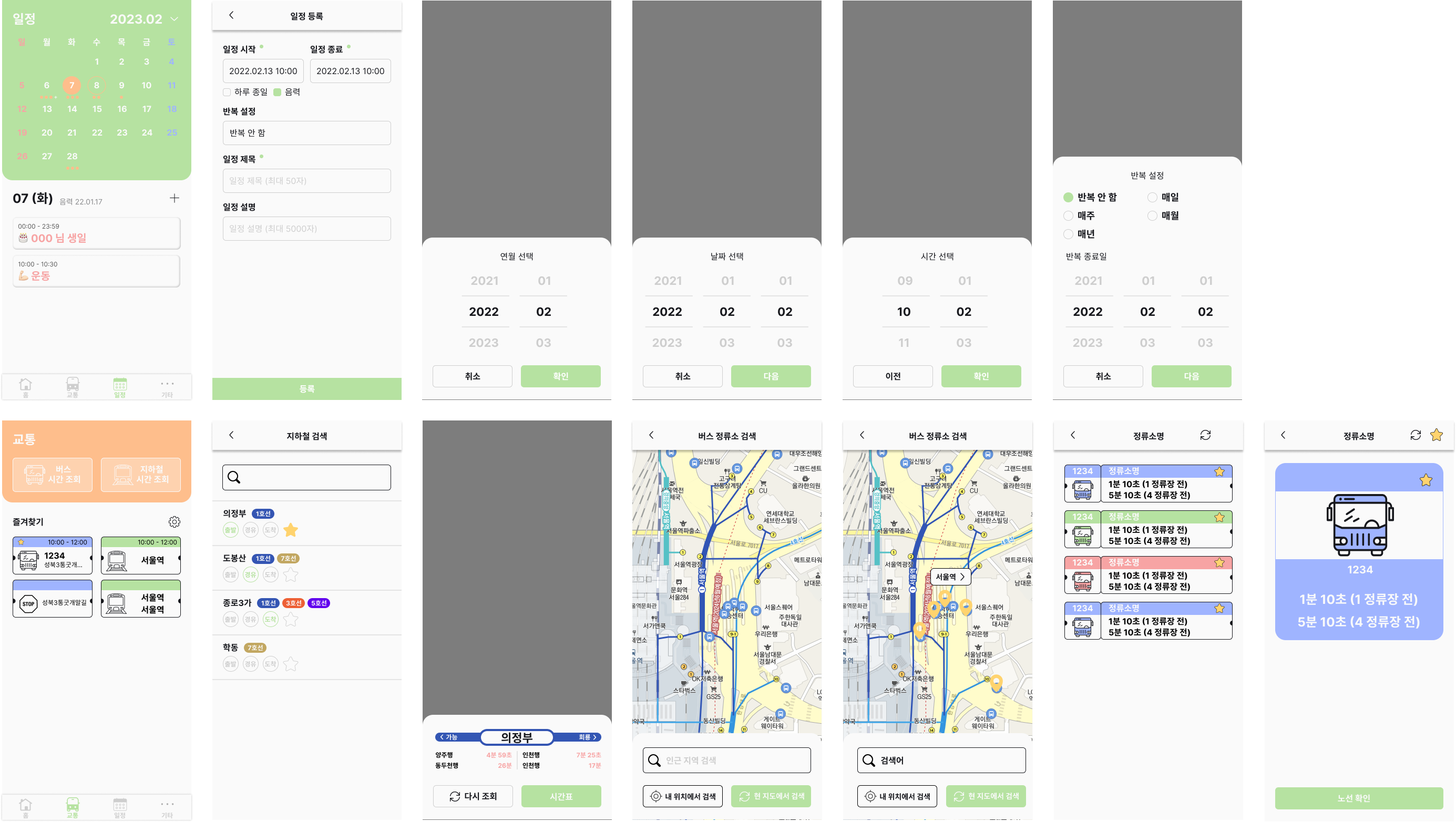 - 교통 화면에서는 지하철과 버스 시간표를 조회하고 즐겨 찾는 장소를 기록하여 빠르게 시간 조회를 제공합니다.
