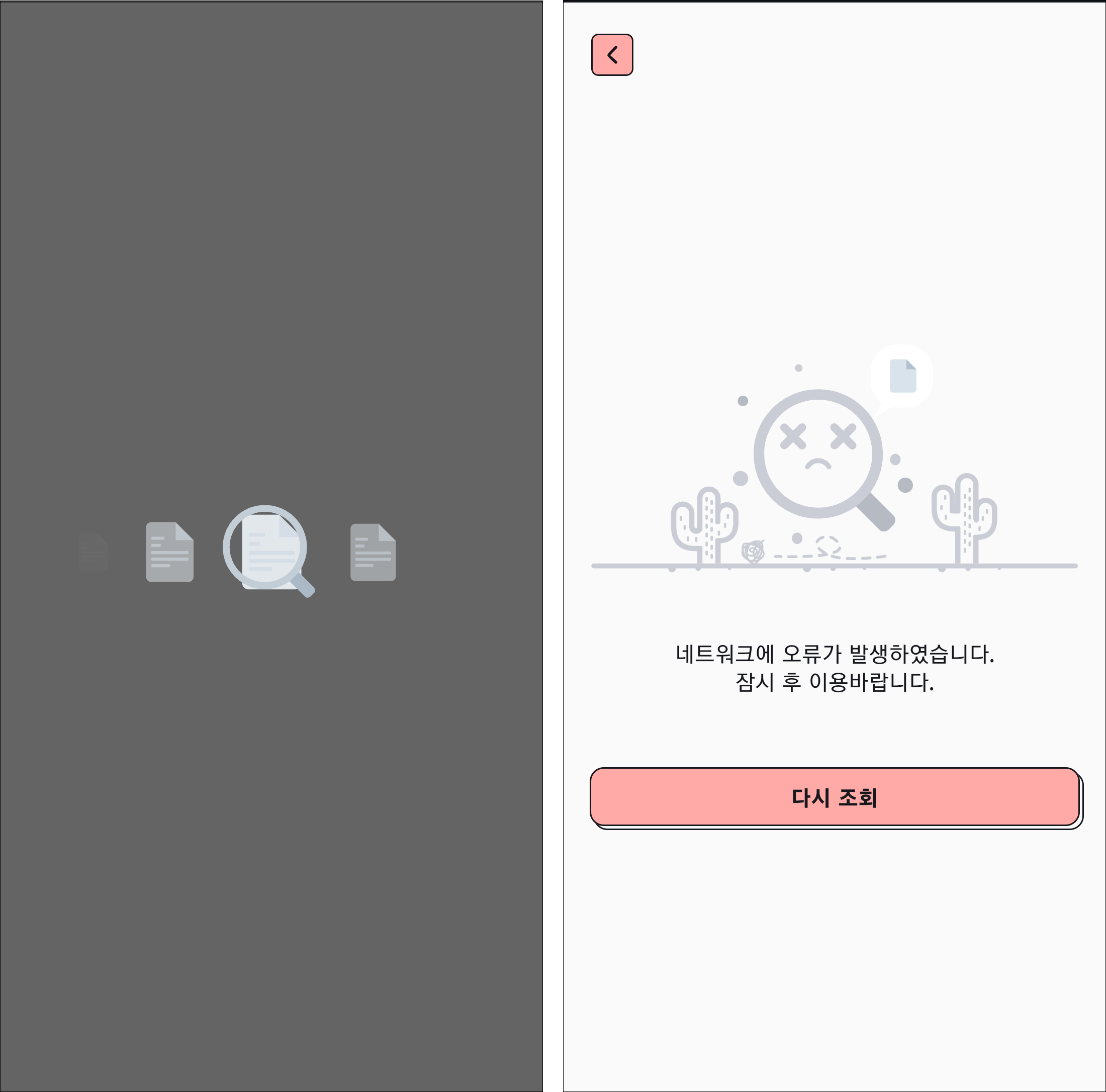 개발을 진행하는 도중 로딩 화면과 네트워크 오류 화면을 앱에 넣고 싶다는 생각이 들었습니다. 당연히 화면 단위로 각자 구현하는 건 실수로 빼먹을 가능성과 관리하기 힘들다는 문제가 있으니 공용으로 사용할 무언가가 필요했습니다.