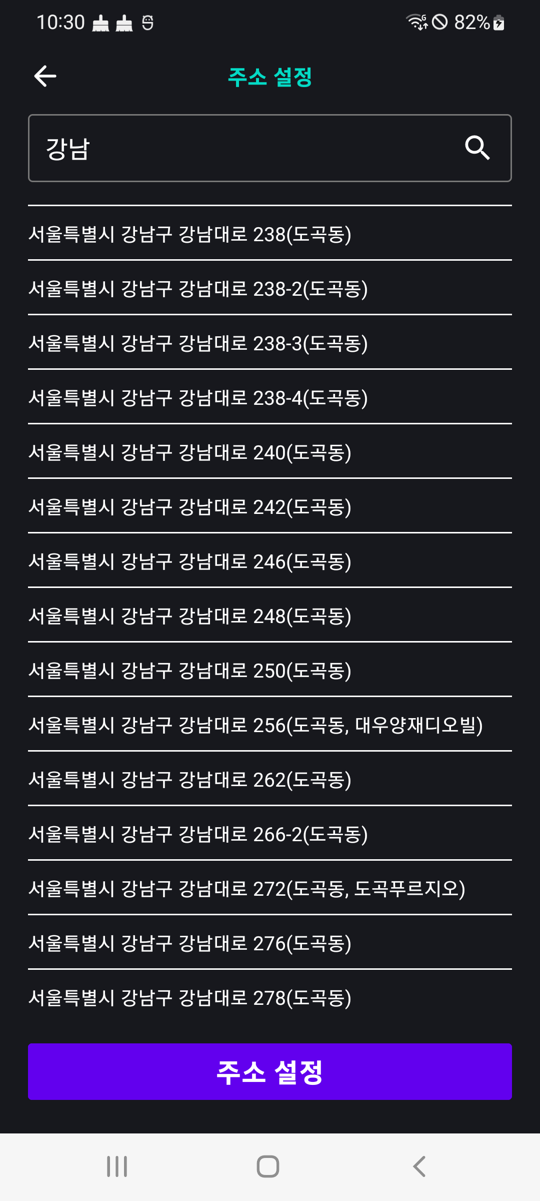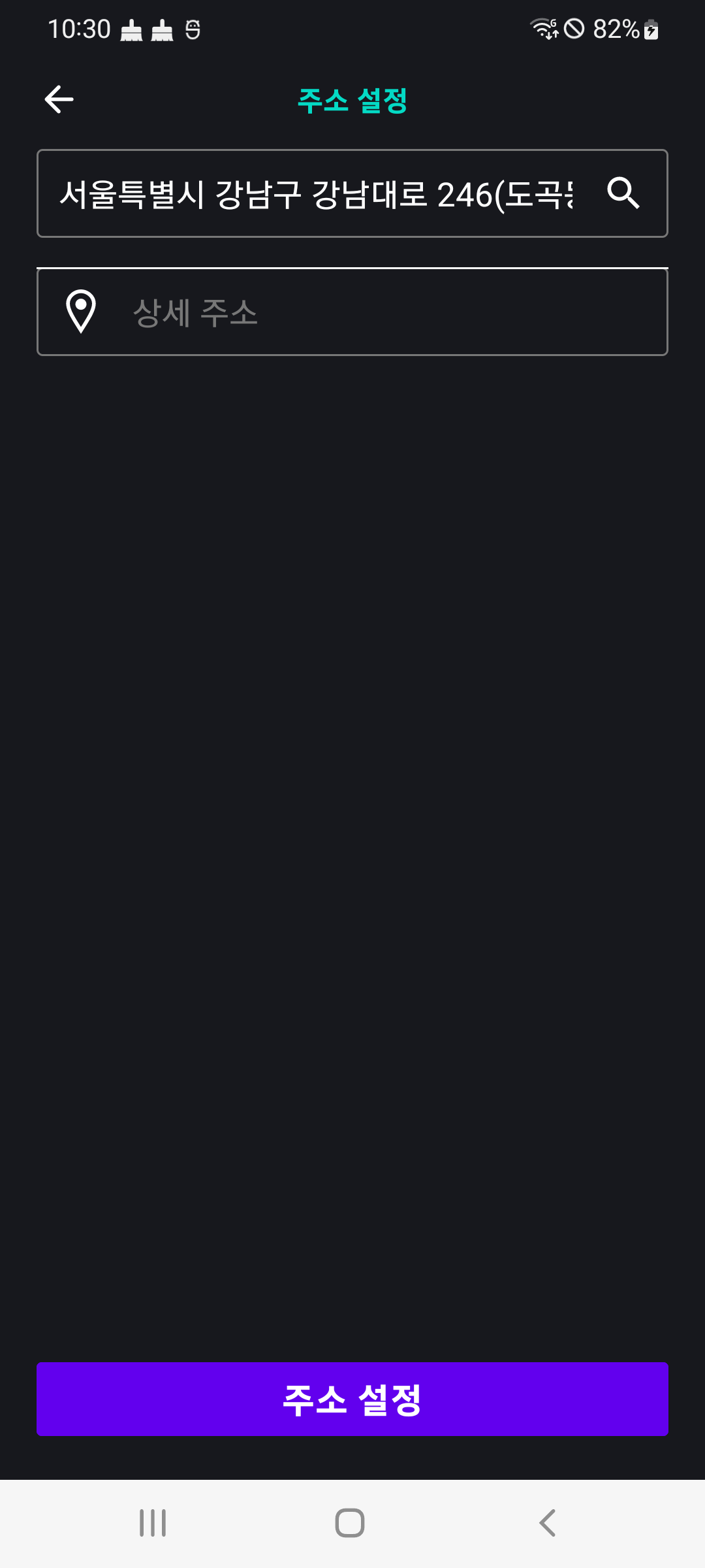 주소 검색 화면입니다. (또 스샷 찍고 나니 두번째 EditTextView 쪽 UI 수정사항이 보이네요..)